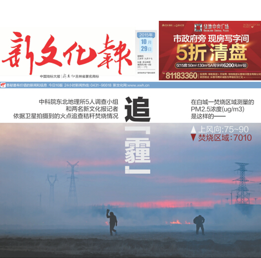 10月25、26日,長春連續(xù)出現(xiàn)“嚴(yán)重污染”天氣,我所區(qū)域大氣環(huán)境學(xué)科組張學(xué)磊、張世春等科研人員從10月27日至30日開展了連續(xù)四天的吉林省內(nèi)秸稈露天焚燒及空氣污染現(xiàn)狀調(diào)研,29日《新文化報》以頭版和專版報道了本次調(diào)研的部分結(jié)果,隨后新華網(wǎng)、新浪網(wǎng)、中新網(wǎng)、中國網(wǎng)等國內(nèi)各主要網(wǎng)絡(luò)媒體對該報道進(jìn)行了大量轉(zhuǎn)載。
