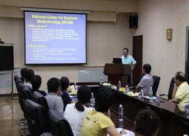 訪問(wèn)期間Henry T. Nguyen教授介紹了美國(guó)密蘇里大豆生物技術(shù)中心的研究領(lǐng)域及成果。他的團(tuán)隊(duì)主要從事大豆高產(chǎn)、抗包囊線蟲(chóng)及抗病性、非生物脅迫和大豆品質(zhì)方面的分子遺傳特性研究,目的是為美國(guó)大豆產(chǎn)業(yè)的發(fā)展提供良好基因資源。目前Henry T. Nguyen教授的團(tuán)隊(duì)利用分子遺傳技術(shù),育成了可代替橄欖油的高油酸大豆品種,已在生產(chǎn)上應(yīng)用,預(yù)計(jì)在未來(lái)幾年有望大面積推廣。會(huì)議期間Henry T. Nguyen教授對(duì)參會(huì)師生提出的具體問(wèn)題進(jìn)行了詳細(xì)的分析與解答。交流會(huì)后,倆位專家參觀了我所的實(shí)驗(yàn)室和試驗(yàn)基地。