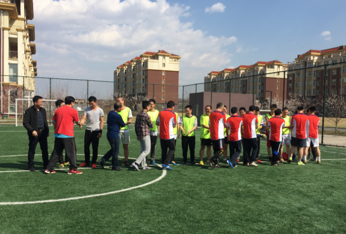 園區(qū)內(nèi)草長鶯飛,桃花盛開,雙方隊(duì)員興致高漲。在正式比賽之前,雙方舉行了簡短的開場儀式,所有運(yùn)動員握手致意后由雙方領(lǐng)隊(duì)開球正式開始比賽。利用主場優(yōu)勢,我所的隊(duì)員迅速占據(jù)了控球優(yōu)勢,掌控了比賽的節(jié)奏,率先一記漂亮的抽射,拿下了全場比賽的第一個進(jìn)球。應(yīng)化所的隊(duì)伍也配合默契,頻繁組織進(jìn)攻。雙方你爭我奪,比賽激烈。比賽共計(jì)三節(jié),每節(jié)20分鐘,最終我所齊心協(xié)力以5比1的戰(zhàn)績?nèi)〉昧吮荣惖膭倮Y惡箅p方球員合影留念,交流賽后心得。