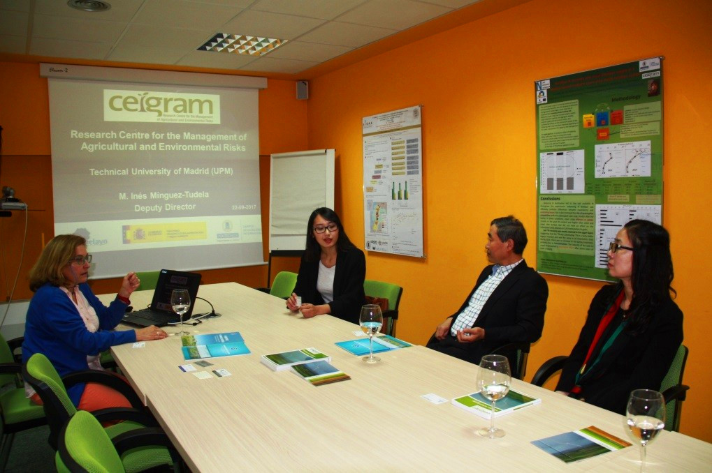 代表團(tuán)一行還順訪了西班牙馬德里理工大學(xué)的農(nóng)業(yè)與環(huán)境風(fēng)險(xiǎn)管理研究中心。農(nóng)業(yè)與環(huán)境風(fēng)險(xiǎn)管理研究中心主任Ines Minguez教授接待了代表團(tuán),并詳細(xì)介紹了西班牙農(nóng)業(yè)概況、農(nóng)業(yè)面臨的威脅與風(fēng)險(xiǎn)、農(nóng)業(yè)保險(xiǎn)制度等,同時(shí)也向代表團(tuán)展示了農(nóng)業(yè)與環(huán)境風(fēng)險(xiǎn)管理研究中心的作用、人力資源基礎(chǔ)設(shè)施、國(guó)際研究合作伙伴、政府合作項(xiàng)目等工作。