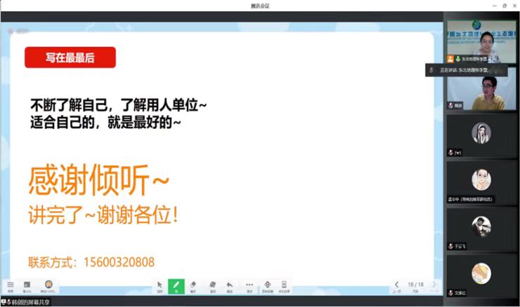 本次分享會,內(nèi)容扎實、豐富且全面,幫助同學們有針對性的了解了目前就業(yè)政策和形勢,有助于引導(dǎo)廣大研究生明確就業(yè)方向、做好學業(yè)規(guī)劃和求職準備。最后,衷心的感謝三位校友對東北地理所研究生就業(yè)工作的支持以及對學弟、學妹的關(guān)心。