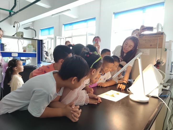 在實(shí)驗(yàn)室和溫室,黃銘慧博士指導(dǎo)同學(xué)們使用顯微鏡觀察線蟲的形態(tài)特征、行為活動(dòng)和生病的植物;李春杰研究員帶領(lǐng)同學(xué)們觀察了接種線蟲后植物的生長(zhǎng)特征,講解了土壤中線蟲的重要作用。同學(xué)們通過觀察土壤中線蟲的形態(tài)和特征,感受到了土壤中動(dòng)物世界的神秘,互動(dòng)問答中,一粒??茖W(xué)的種子在同學(xué)們的心中被悄悄種下。