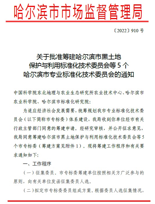 近日,中科院東北地理所農業技術中心申請籌建哈爾濱市黑土地保護與利用專業技術標準化委員會獲批復。