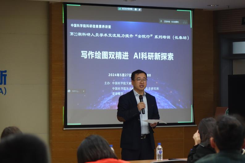 ????2024年5月27日,由中國科學院文獻情報中心、中國科學院東北地理與農業(yè)生態(tài)研究所主辦,科研計劃處和人事教育處共同承辦的第22期科研人員學術交流能力提升“全院行”系列培訓活動在長春召開,主題為“寫作繪圖雙精進?AI科研新探索”。學術講座線上線下同步進行,共計100余名科研人員及研究生參加。會議由中國科學院文獻情報中心咨詢服務部副主任閆亞飛主持。