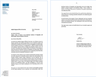 近日,東北地理所收到聯合國教科文組織(UNESCO)東亞地區辦事處發來的官方感謝信,對研究所長期以來開展國際學術交流和青年活動等工作的努力和貢獻表示感謝,聯合國教科文組織東亞地區辦事處主任,聯合國教科文組織駐朝鮮民主主義人民共和國、日本國、蒙古國、中華人民共和國及大韓民國代表夏澤翰教授為感謝信署名。