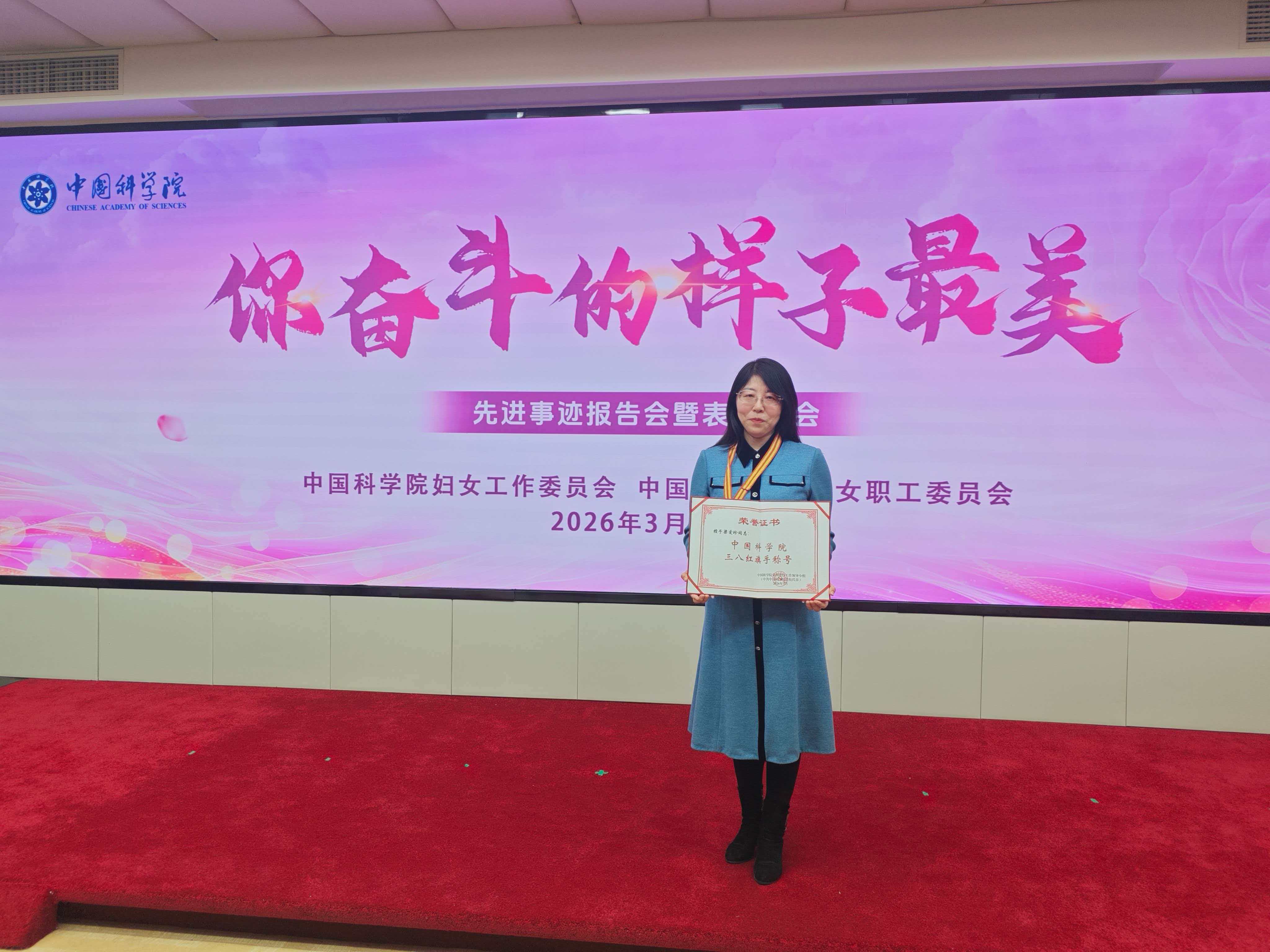 為選樹(shù)先進(jìn)典型,激勵(lì)引領(lǐng)全院廣大女干部職工積極投身科技創(chuàng)新,努力為建設(shè)世界科技強(qiáng)國(guó)作出貢獻(xiàn),在2026年“三八”國(guó)際勞動(dòng)?jì)D女節(jié)來(lái)臨之際,3月5日上午,中國(guó)科學(xué)院婦女工作委員會(huì)、中國(guó)科學(xué)院工會(huì)女職工委員會(huì)舉辦“你奮斗的樣子最美”先進(jìn)事跡報(bào)告會(huì)暨表彰大會(huì)。大會(huì)表彰了15名“中國(guó)科學(xué)院三八紅旗手”和5個(gè)“中國(guó)科學(xué)院三八紅旗集體”。我所梁愛(ài)珍研究員榮獲第三屆“中國(guó)科學(xué)院三八紅旗手”榮譽(yù)稱(chēng)號(hào)。