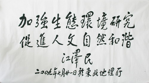 11時30分,江澤民健步來到我所科研大樓的大廳中間,揮毫題詞:“加強生態(tài)環(huán)境研究,促進人文自然和諧”。這十六個遒勁的大字,將極大地促進我所的知識創(chuàng)新工程工作,為國家科技事業(yè)和地方經(jīng)濟發(fā)展做出更大貢獻!