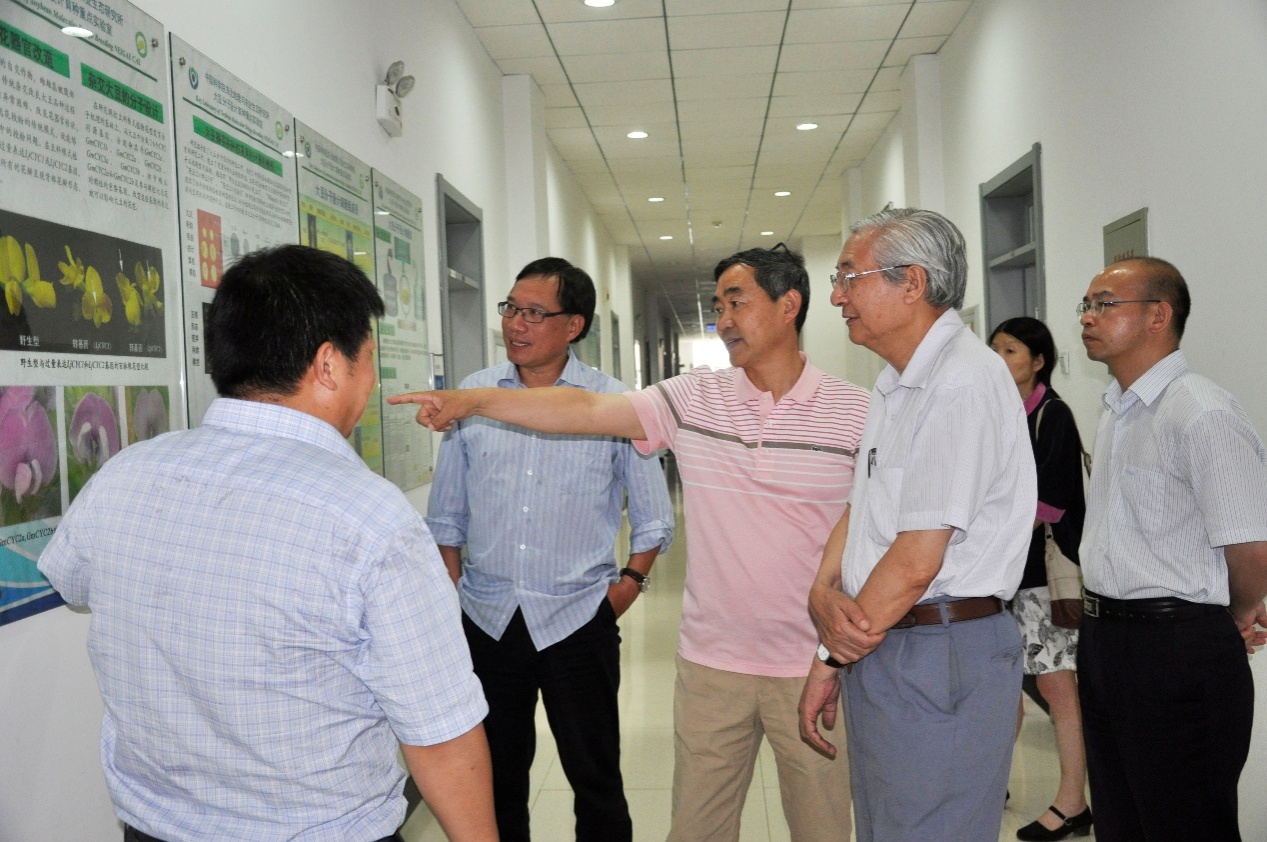 在農(nóng)業(yè)樓,馮獻忠研究員介紹了大豆分子設(shè)計育種重點實驗室的工作,并專題匯報了“雜交大豆異交率差異的分子遺傳機制”的研究計劃。許智宏院士和何祖華研究員對于實驗室的工作予以了肯定,對于通過分子設(shè)計提高雜交大豆產(chǎn)量的研究工作表示支持,希望繼續(xù)加強研究工作,將現(xiàn)代生物技術(shù)充分應(yīng)用到農(nóng)業(yè)生產(chǎn)中去。