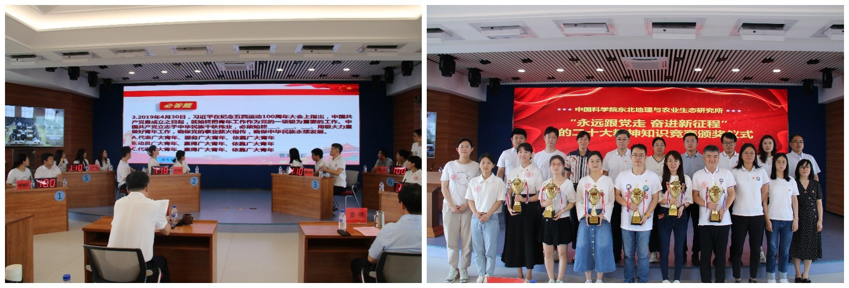 舉辦“永遠跟黨走 奮進新征程”黨的二十大精神知識競賽。各黨支部組成濕地隊、黑土隊、大豆隊、遙感區(qū)域隊、管理支撐隊、研究生隊共6支隊伍參賽。競賽設必答題、輪答題、搶答題、風險題四個環(huán)節(jié)。各代表隊選手準備充分,氣氛緊張激烈,觀眾掌聲不斷。最終黑土隊獲得冠軍,遙感區(qū)域隊獲得亞軍,大豆隊獲得季軍;管理支撐隊獲得團結拼搏獎,研究生隊獲得齊心協(xié)力獎,濕地隊獲得最佳風采獎。