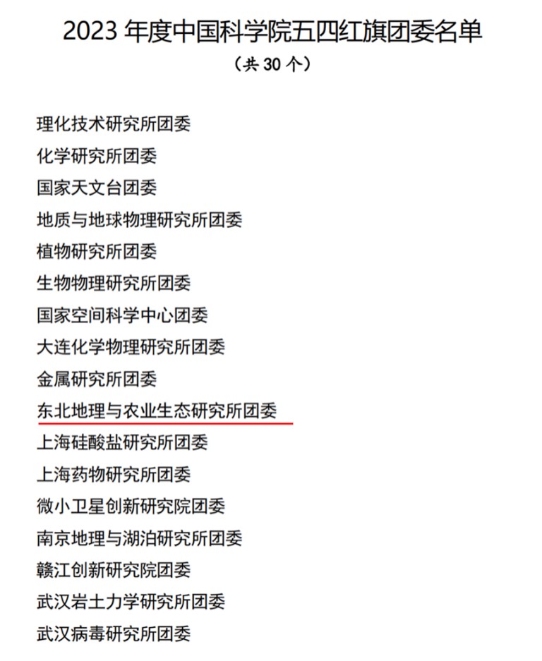 為表彰先進(jìn)、樹立典型,激勵(lì)團(tuán)青組織和廣大團(tuán)員、團(tuán)干部奮勇爭(zhēng)先、再創(chuàng)佳績。近日,中國科學(xué)院團(tuán)委發(fā)文對(duì)30個(gè)五四紅旗團(tuán)委、30個(gè)五四紅旗團(tuán)支部、50名優(yōu)秀共青團(tuán)干部、100名優(yōu)秀團(tuán)員青年進(jìn)行表彰。中國科學(xué)院東北地理與農(nóng)業(yè)生態(tài)研究所團(tuán)委榮獲“2023年度五四紅旗團(tuán)委”稱號(hào)、2023級(jí)博士研究生龍小雨榮獲“2023年度中國科學(xué)院優(yōu)秀共青團(tuán)員”稱號(hào)。