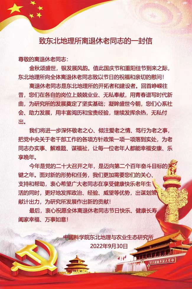 思想之旗領(lǐng)航向,人間正道開新篇。東北地理所將把學(xué)習(xí)宣傳貫徹黨的二十大精神作為當(dāng)前和今后一段時期的重要政治任務(wù),把學(xué)習(xí)宣傳貫徹黨的二十大精神與持續(xù)深入學(xué)習(xí)習(xí)近平總書記關(guān)于中國科學(xué)院“四個率先”“兩加快一努力”的重要指示批示精神等結(jié)合起來,把黨的二十大精神貫穿到離退休工作的全過程,多措并舉在離退休干部中持續(xù)保持學(xué)習(xí)宣傳貫徹黨的二十大精神熱潮。