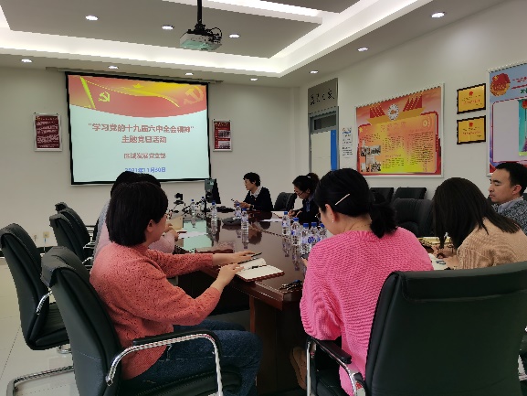 本月主題黨日的活動主題是“學習黨的十九屆六中全會精神”,商麗娜首先帶領全體黨員學習了黨的十九屆六中全會的主體內容框架,并結合省委黨校黨建專家丁彬教授作的關于黨的十九屆六中全會精神的專題輔導報告和近期自身的學習,跟全體黨員分享了心得體會。商麗娜強調,作為黨員不僅要體現在學習的形式上,更要結合各自工作崗位的實踐,踐行會議精神。與會黨員紛紛圍繞各自對黨的十九屆六中全會報告的具體內容和上午的報告會,分享了各自對黨的六中全會精神的認識,大家紛紛表示,通過學習,更加全面的了解了黨的歷史,更為深刻的體會到我們黨的與時俱進和不斷創新的精神,也更好的理解了黨在不同歷史發展階段中的各項方針政策,未來還要進一步加強對全會精神的學習,并且在實踐中更加堅定的聽黨話,跟黨走。
