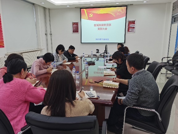 2021年11月30日下午,區域發展黨支部在綜合樓四樓黨員活動室召開11月份主題黨日活動和支部大會,活動由支部書記商麗娜主持,支部全體黨員參加。
