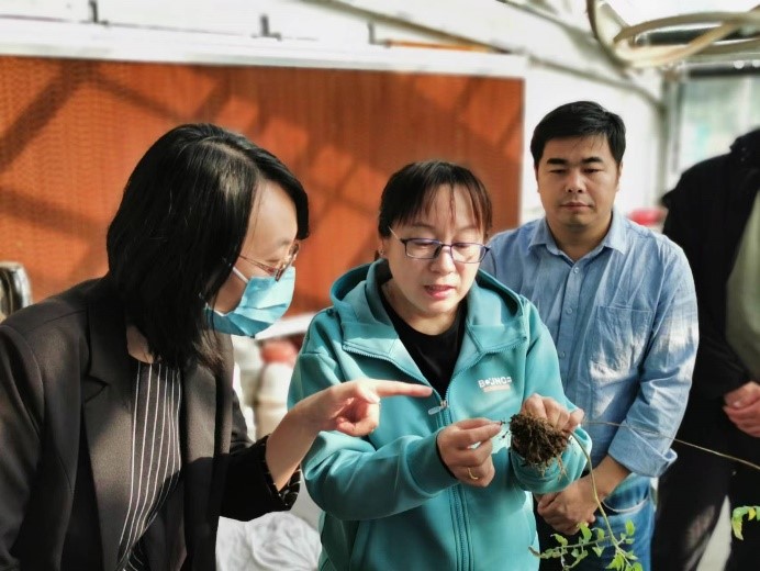 小組成員首先參觀了農(nóng)田有害生物控制學(xué)科組的溫室試驗(yàn),學(xué)科組副組長李春杰研究員以大豆根腐病、孢囊線蟲病、大豆食心蟲和地下害蟲等為例介紹了大豆土傳病害、大豆蟲害的癥狀、傳播途徑和危害等等,并且針對(duì)不同的大豆病蟲害,李春杰又介紹了相應(yīng)的綠色防控技術(shù),如用自主研發(fā)的昆蟲病原線蟲制劑防治地下害蟲,間套作模式及生防細(xì)菌防治土傳病害,目前這些生物生態(tài)控制作用機(jī)制已逐漸明確,相應(yīng)的技術(shù)也已示范推廣應(yīng)用。
