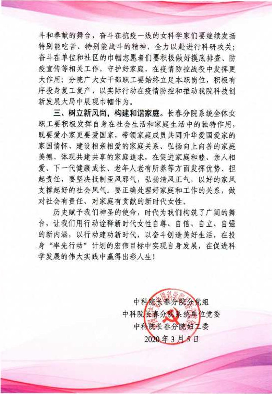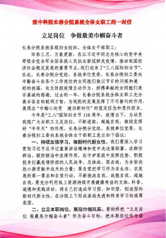 致中科院長春分院系統全體女職工的一封信