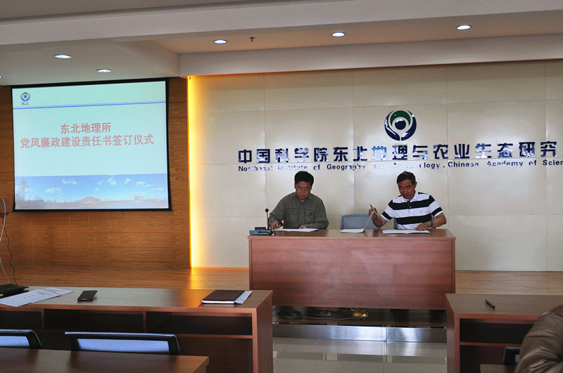 簽署儀式上,東北地理所所長何興元、黨委書記蘇陽分別與所班子成員、所班子成員與分管的各職能部門、重點實驗室、支撐部門負責人分別簽訂了責任書《中國科學院東北地理與農業生態研究所反腐倡廉建設責任書》。